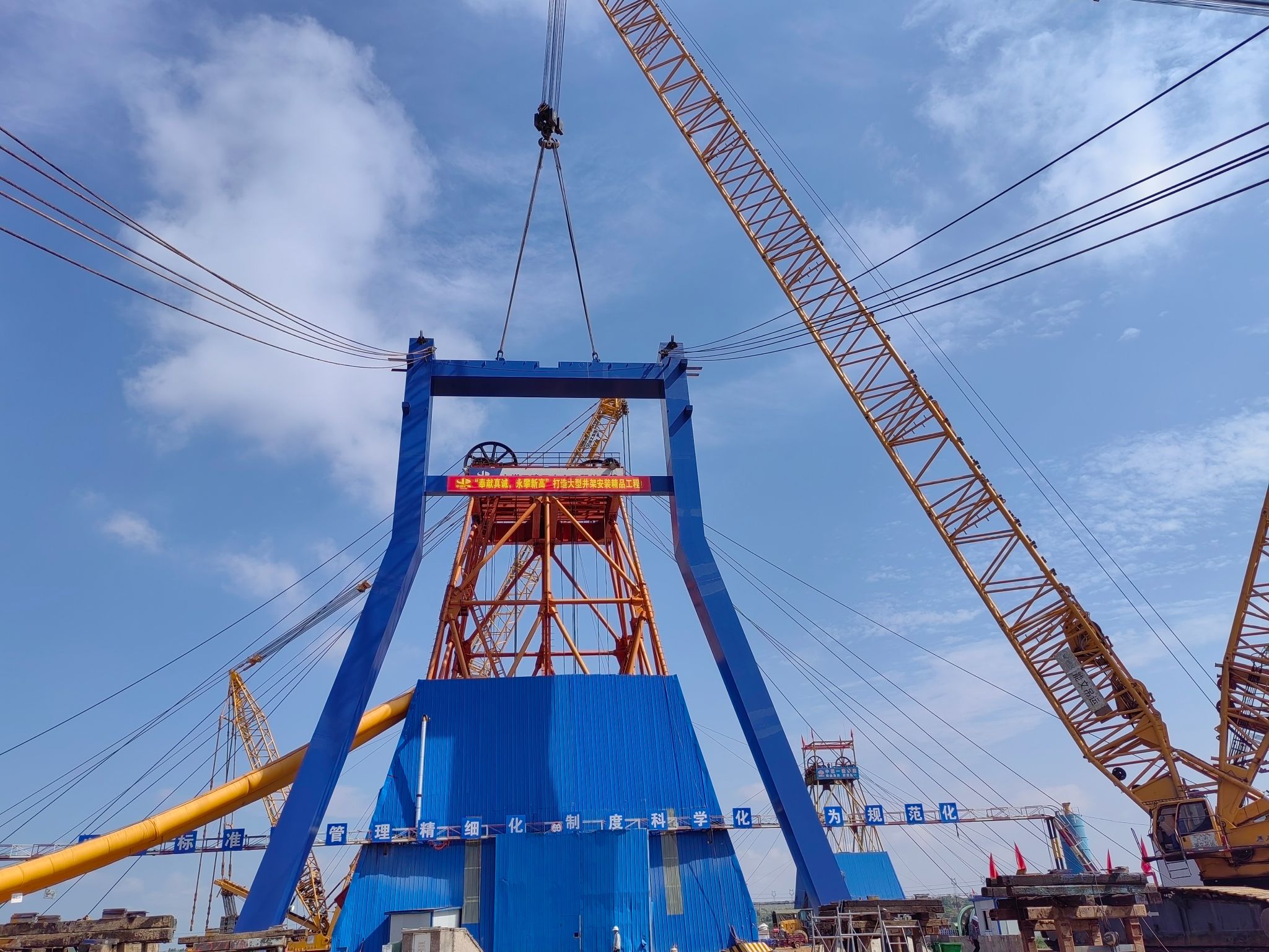 据了解,海则滩煤矿副井井架安装工程是公司确立的重点工程和安全生产重点监管项目之一,主要包括井架制作与安装。井架为双斜撑式钢井架,高度49米,主斜架、副斜架总重量约1054吨,其中副斜架约283吨,在施工组织设计中,根据大型箱形钢结构的结构特点、几何尺寸、重量参数及现场安装条件等实际情况,采取井口外分片组对、分段吊装、分单元平移就位焊接固定的工艺进行施工,本次按照施工设计要求首先完成副斜架支腿分段组装旋转180度找正就位的方式,顺利找正就位副斜架支腿约226吨。