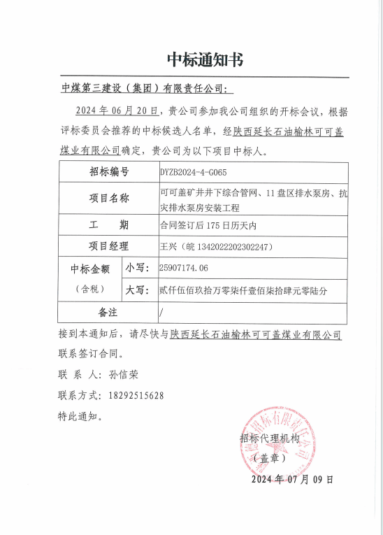 可可盖矿井井下综合管网、11盘区排水泵房、抗灾排水泵房安装工程项目位于陕西省榆林市榆阳区,主要建设内容包括可可盖矿井井下11盘区水泵房、配电室及井下大巷部分消防洒水管道、排水管道、压缩空气管道、注氮管道等安装;排水泵房自动化排水控制系统安装、设备入井运输、设备试验等配套工程,工期为175日历天。
